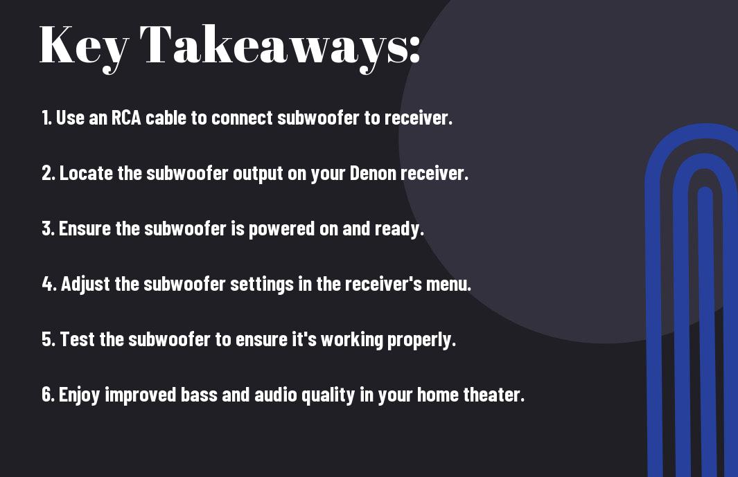 Ultimately, connecting a subwoofer to your Denon receiver is a simple process that can greatly enhance your audio experience. By following the proper steps outlined in this guide, you can ensure that your subwoofer is properly connected and optimized for the best sound quality. Remember to check your receiver’s manual for specific instructions and always be mindful of safety precautions when working with electrical equipment. With these steps, you can enjoy a more immersive and powerful audio experience in your home entertainment system.