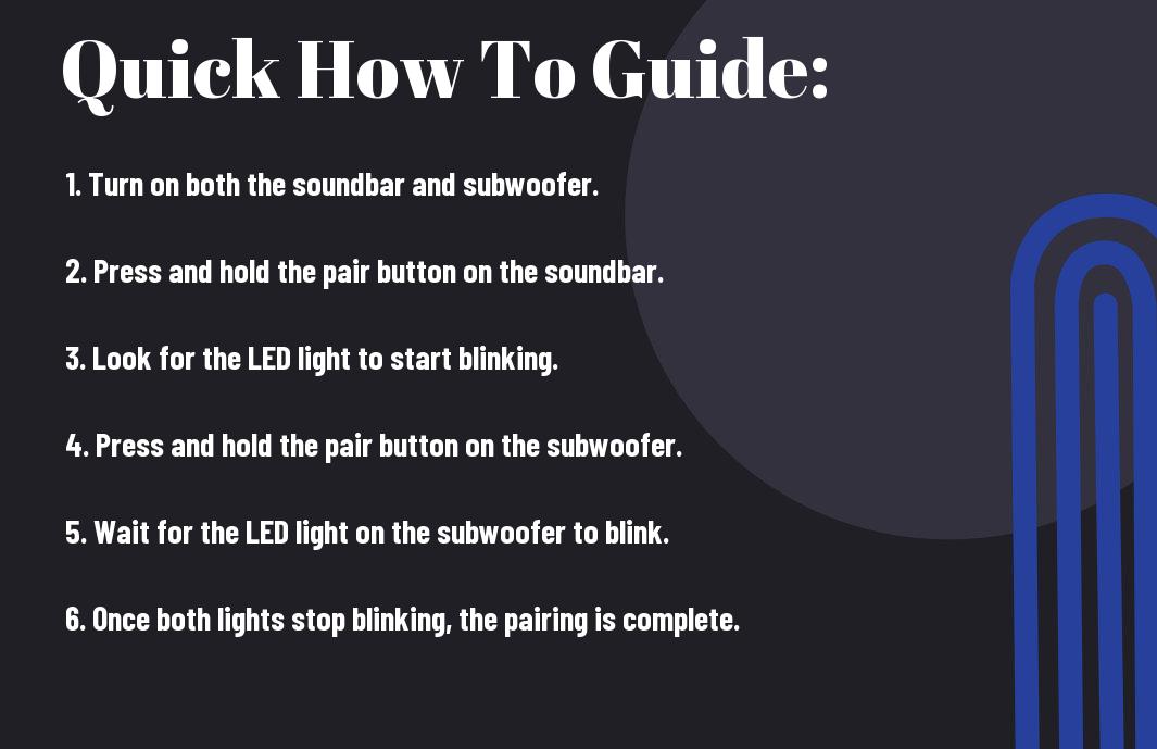 Now that you have completed the preliminary checks, it’s time to dive into the pairing process. First, locate the pairing buttons on both the soundbar and the subwoofer. Press and hold the pairing button on the soundbar until the LED indicator starts flashing. Next, do the same for the subwoofer by pressing and holding the pairing button until its LED indicator also starts flashing. Once both devices are in pairing mode, they will automatically connect to each other. You can confirm a successful pairing when the LED indicators on both devices stop flashing and remain solid.